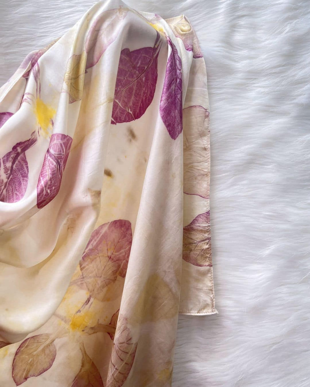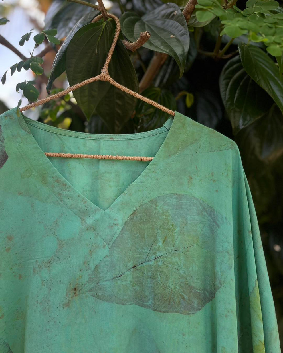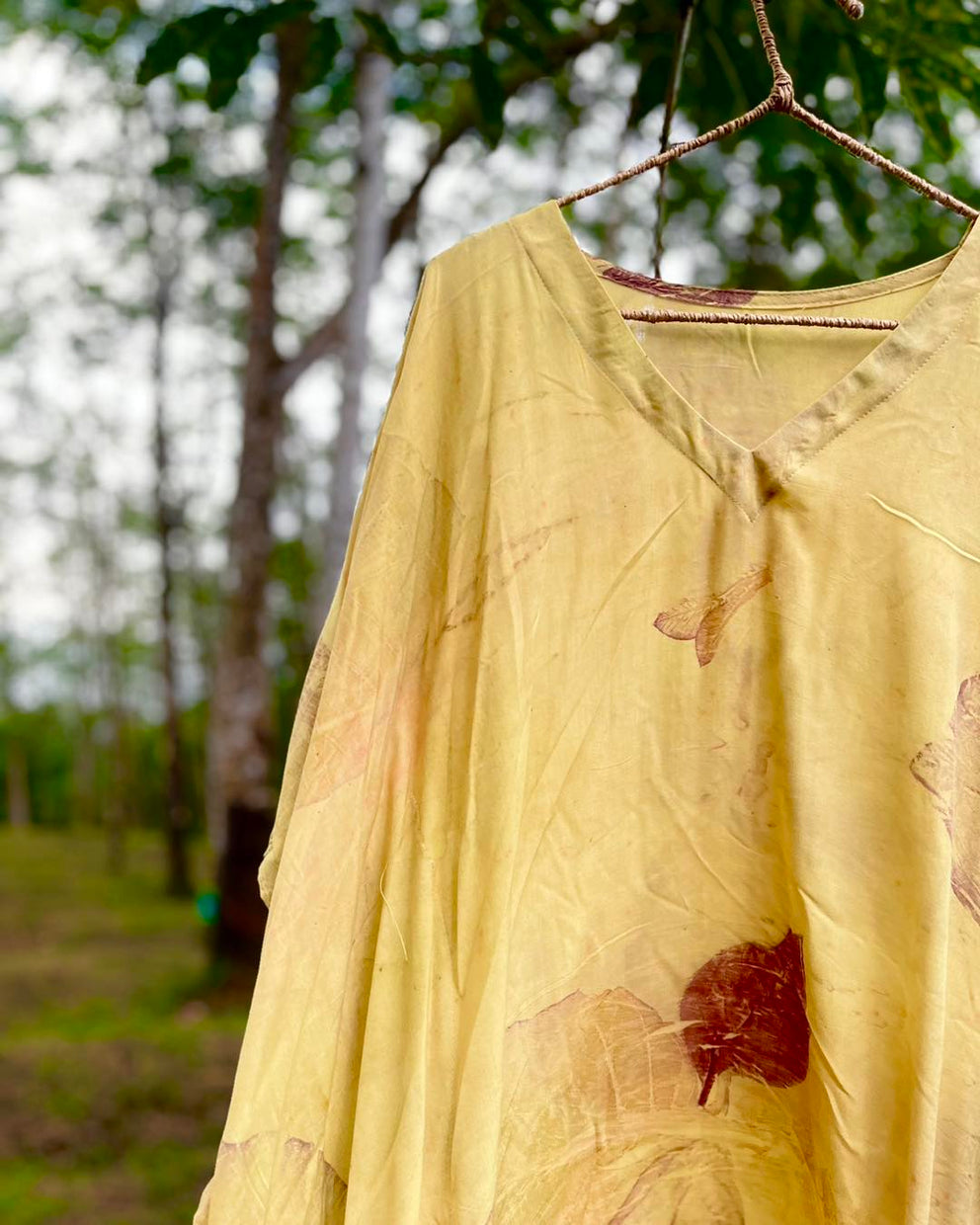 Each piece is uniquely designed with eco-printed fabrics, made using natural Rangoon Creeper leaf pigments instead of synthetic dyes. This not only ensures a one-of-a-kind look but also supports a more sustainable and eco-conscious lifestyle.