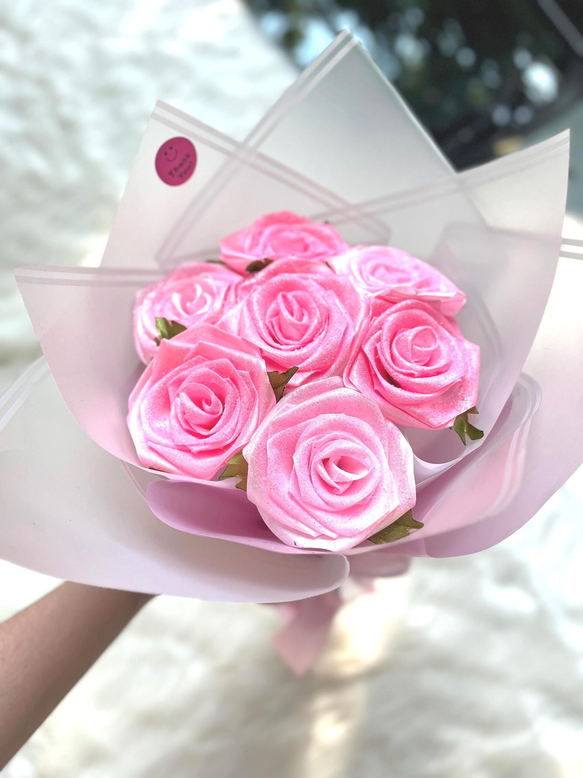 Pink Glitter Rose Ribbon Bouquet, Satin Fabric, Non-Wilting Wedding Decor, Bridesmaid Proposal