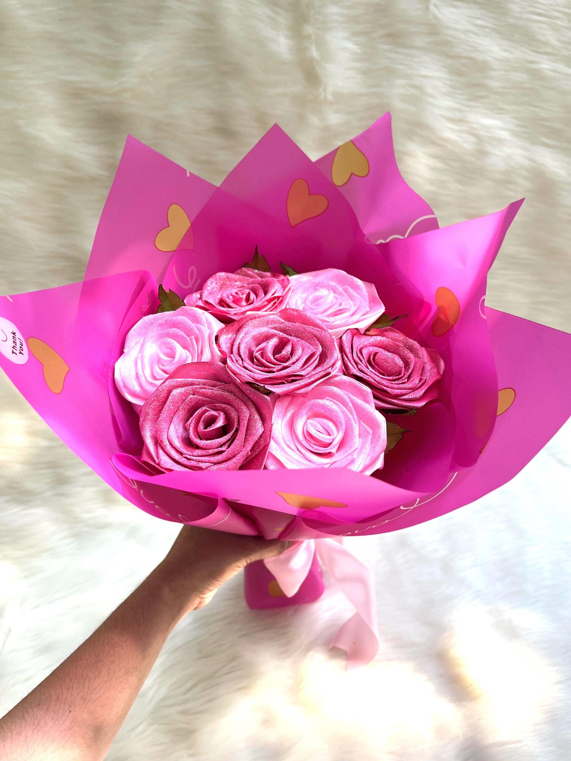Satin Ribbon Rose Bouquet | Pink Glitter Faux Flowers | Wedding Decor Gift