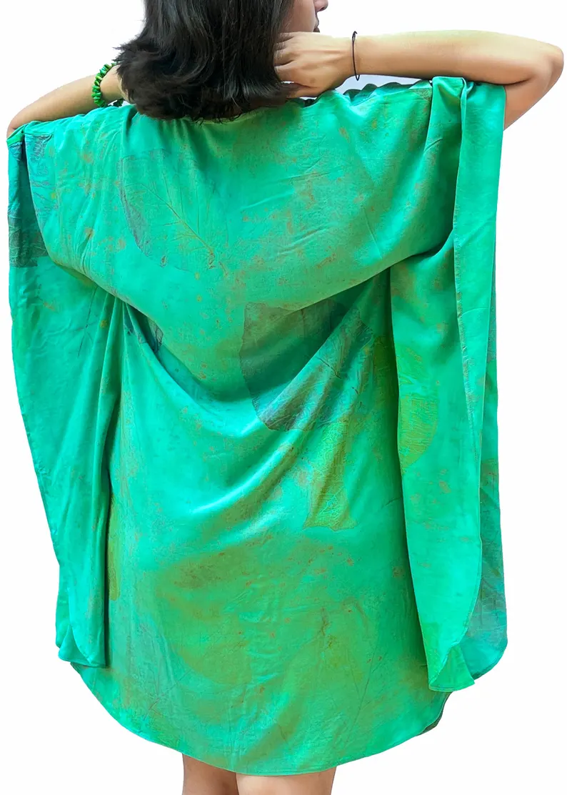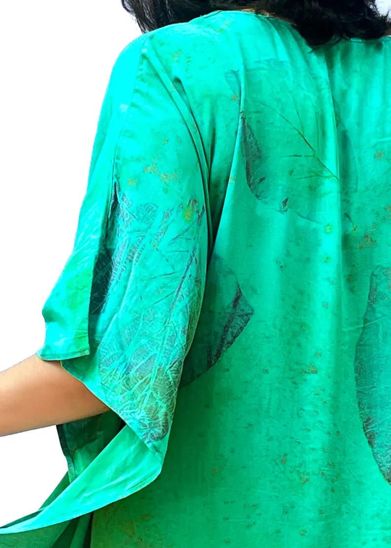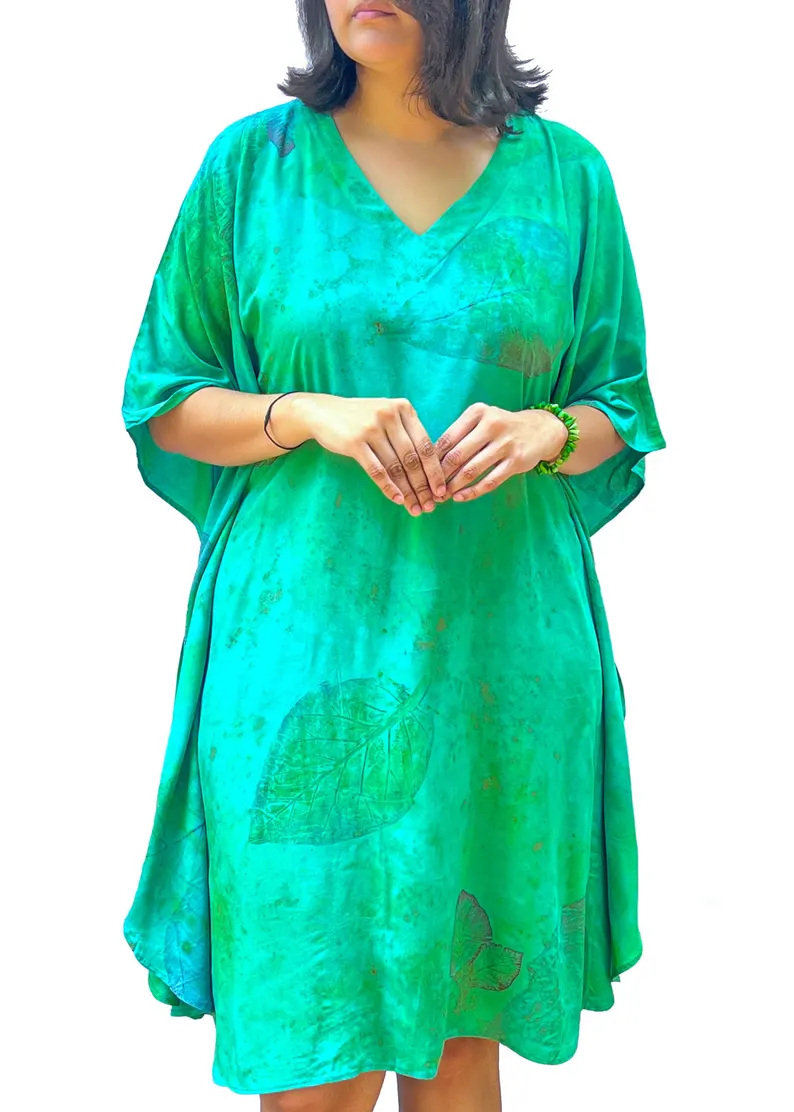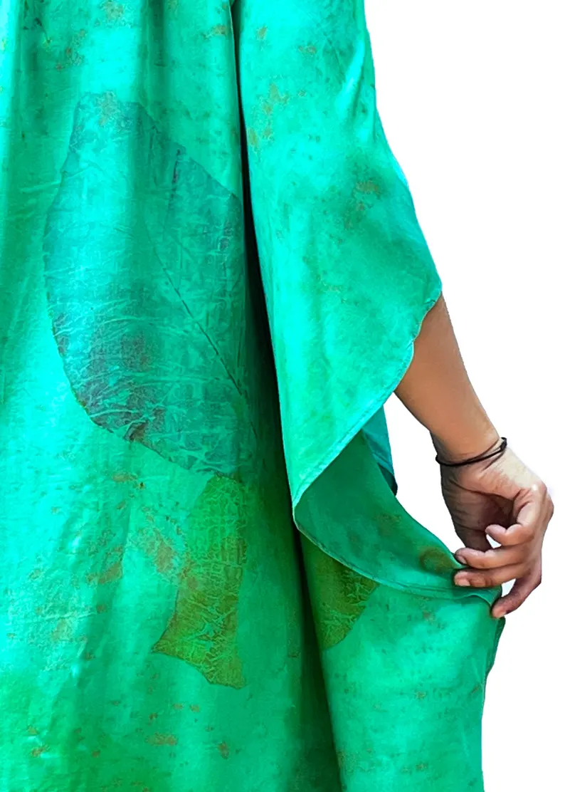 Teal Emerald Leaf Print Kaftan Dress | Bohemian Resort Wear V-Neck Tunic